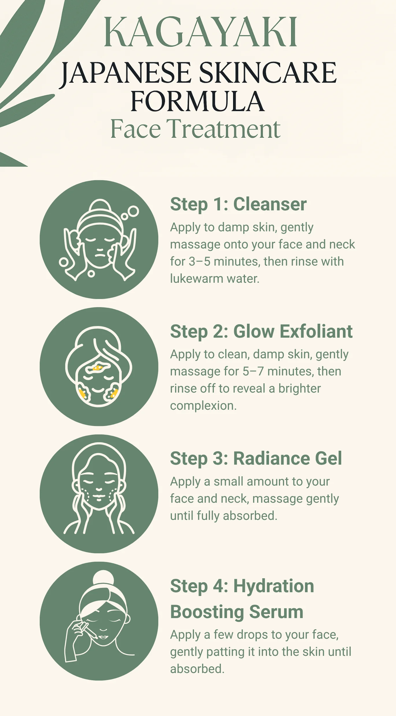 CLEANSER | GLOW EXFOLIANT | RADIANCE GEL | HYDRATION BOOSTING SERUM Experience a complete skincare regimen with the KAGAYAKI Face Treatment Set, featuring a Cleanser, Glow Exfoliant, Radiance Gel, and Hydration Boosting Serum. Infused with Japanese botanicals like Shiso and Matcha, plus powerful ingredients like Glycolic Acid, Hyaluronic Acid, and Niacinamide, this 4-step treatment cleanses, exfoliates, brightens, and deeply hydrates for a radiant and revitalized complexion. Perfect for achieving smooth, glowing skin with every use.