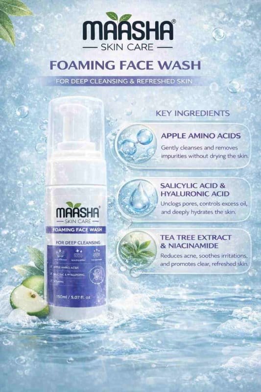 MAASHA Foaming Face Wash is a gentle yet effective cleanser designed for deep cleansing and refreshed skin. Its lightweight foaming formula helps remove dirt, excess oil, and impurities without stripping the skin of its natural moisture.