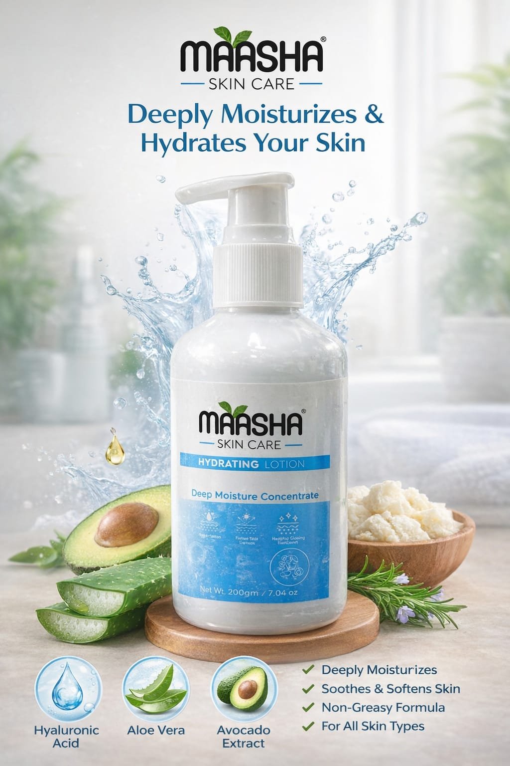 Maasha Skin Care Hydrating Lotion is a rich, deep moisture concentrate formulated to deliver intense hydration to all skin types. Infused with the goodness of Aloe Vera & Ceramide, it helps restore the skin’s natural moisture barrier and repairs daily skin damage. Shea Butter adds an extra layer of nourishment, leaving skin soft, supple, and visibly glowing. Whether your skin is dry, oily, or combination, this lotion works to balance and hydrate from within. Use it daily for a healthier, more radiant complexion.