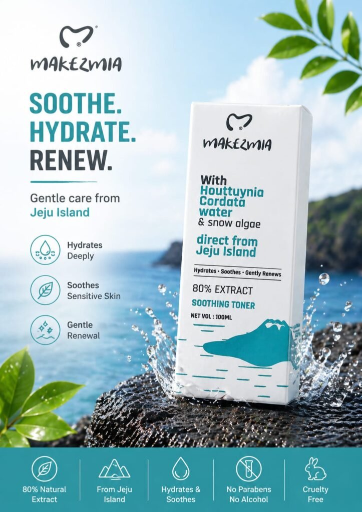 Experience the purity of nature with MAKEZMIA Soothing Toner, enriched with Houttuynia Cordata Water and Snow Algae Extract, sourced directly from the pristine environment of Jeju Island. This powerful yet gentle formula is designed to deeply hydrate, calm irritation, and restore your skin’s natural balance.