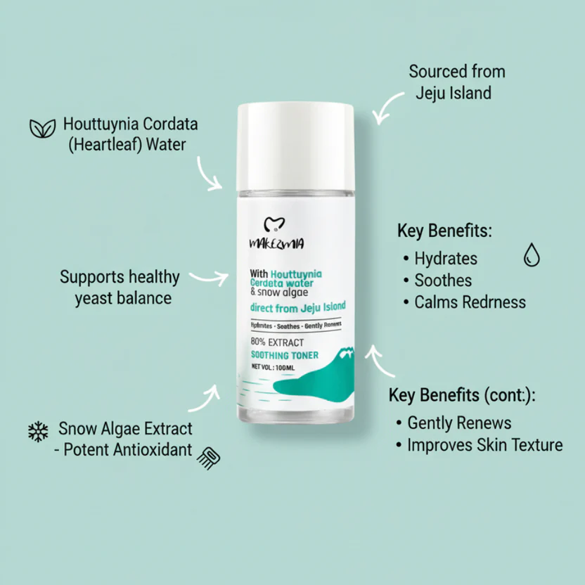 Experience calm, refreshed, glass-like skin with Makezmia Soothing Toner, powered by the purity of Jeju Island.