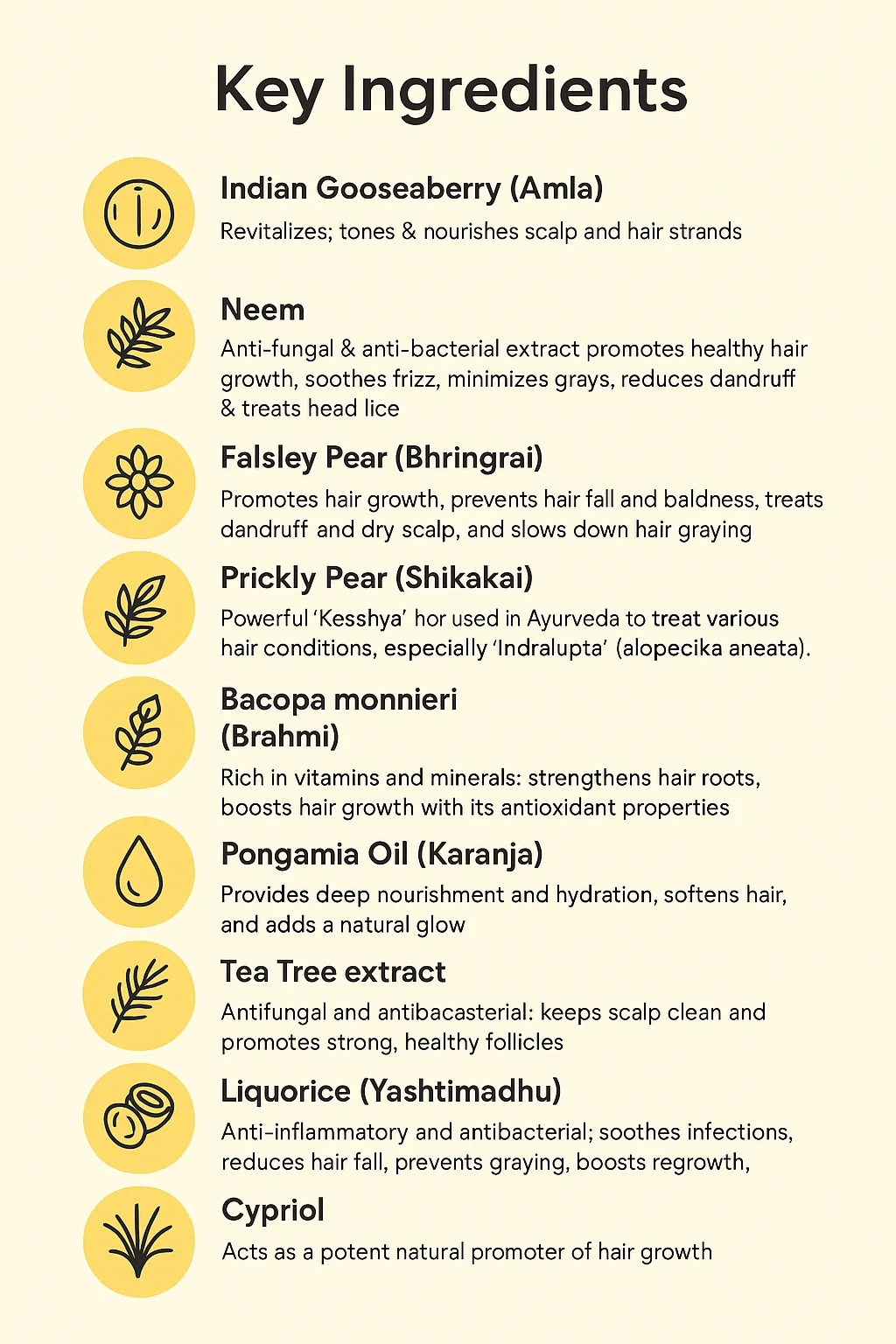 - Myrobalan (Amla): revitalizes, tones & nourishes scalp and hair strands.