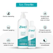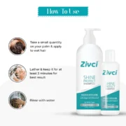 Zivci’s Shine Protect shampoo clearly protects your hair shine to make it look perfect for any function. It is formulated with techniques that cover your hair shine. And make it glowy, specially protecting against UV sunrays and pollution. Provide instant smoothness. Protect hair shafts gently. It helps to maintain the integrity of coloured hair and prevents its fading.